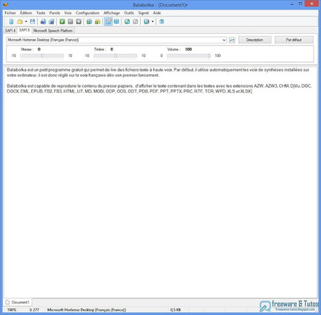 Balabolka est un petit programme gratuit qui permet de lire des fichiers texte à haute voix. Par défaut, il utilise automatiquement les voix de synthèses installées sur votre ordinateur, il est donc réglé sur la voix française dès son premier lancement.